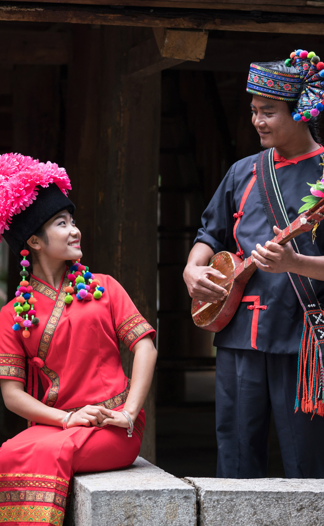 云南壯族主要聚居在文山州,人口114萬,民間的村寨大多依山傍水。壯族擅長(zhǎng)種植水稻,有太陽崇拜和長(zhǎng)老崇拜的風(fēng)俗,視銅鼓為重器,厚愛銀飾,善烹制五色花米飯,能歌善舞,熱情好客。進(jìn)入景區(qū)壯族村,迎面有祭祀龍王的龍柱,兩邊是先民繪制的天王崖畫和為紀(jì)念傳說洪水泛濫時(shí)幫助先民度過劫難而建的石葫蘆亭。祭祀玉皇大帝的昊天閣和傳說能驅(qū)邪納福的碩大銅鼓聳立在廣場(chǎng)兩側(cè)。桿欄式和麻欄式民居、壯族青年社交休憩的“情廊”、村...